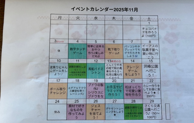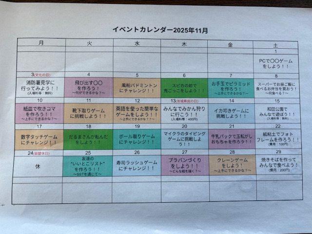 公開したのは少し過去の物になっていますが、1か月の主活動がこのような形で決められています。長期休みには、外出などのイベント(白)も平日に含まれたりしますよ😁イベントの内容はインスタで更新しているので、そちらも合わせて見ていただけたら嬉しいです❤️